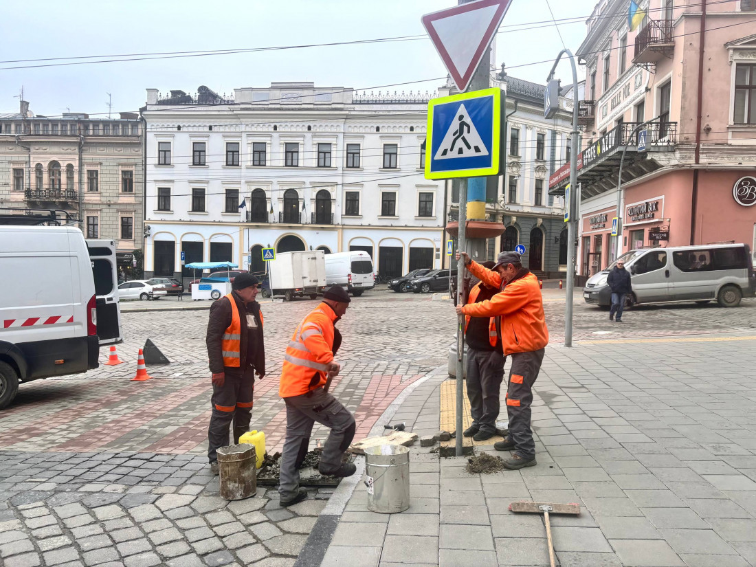 Перед Ратушею на Центральній площі Чернівців тривають роботи з оновлення організації дорожнього руху.